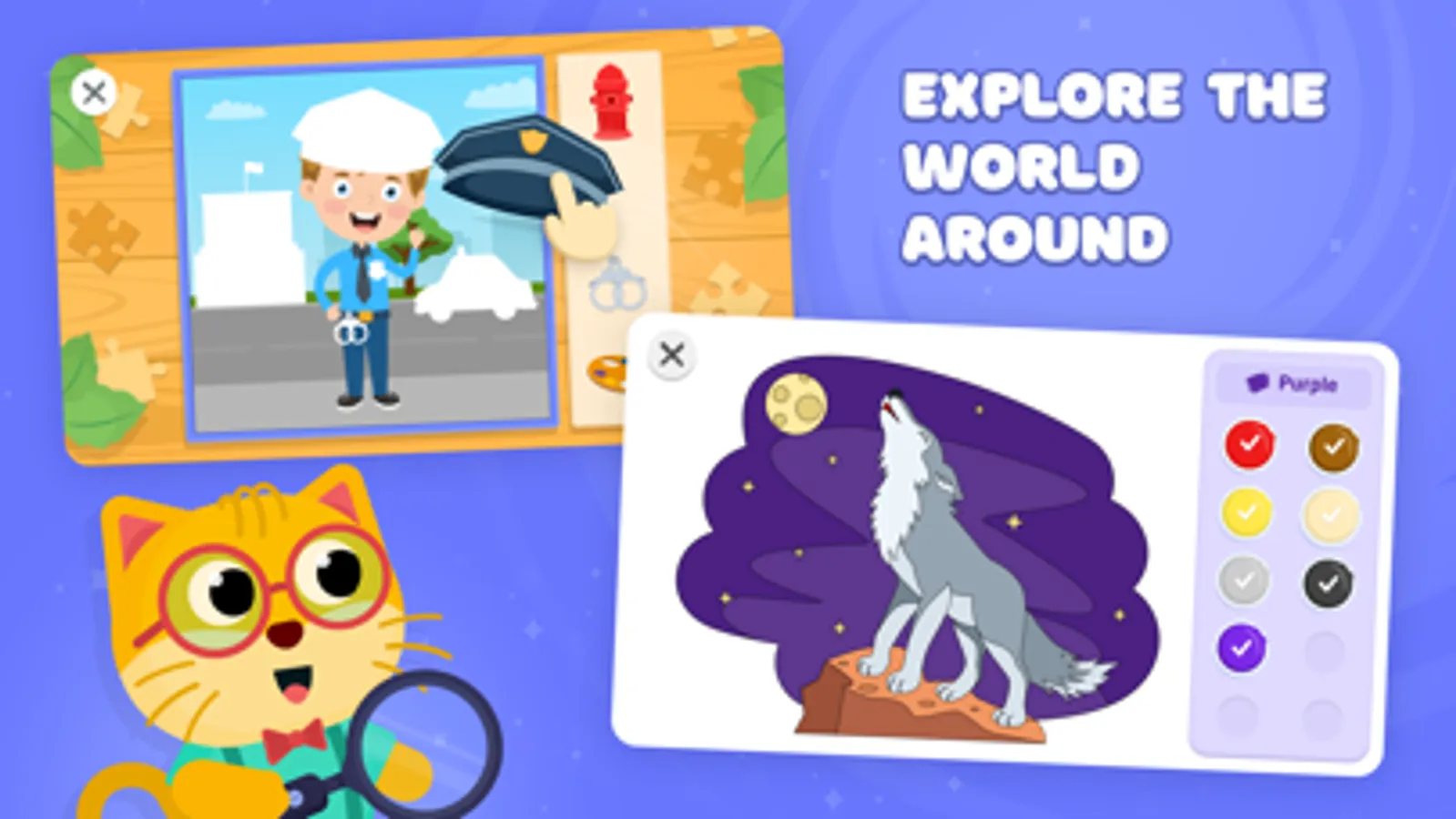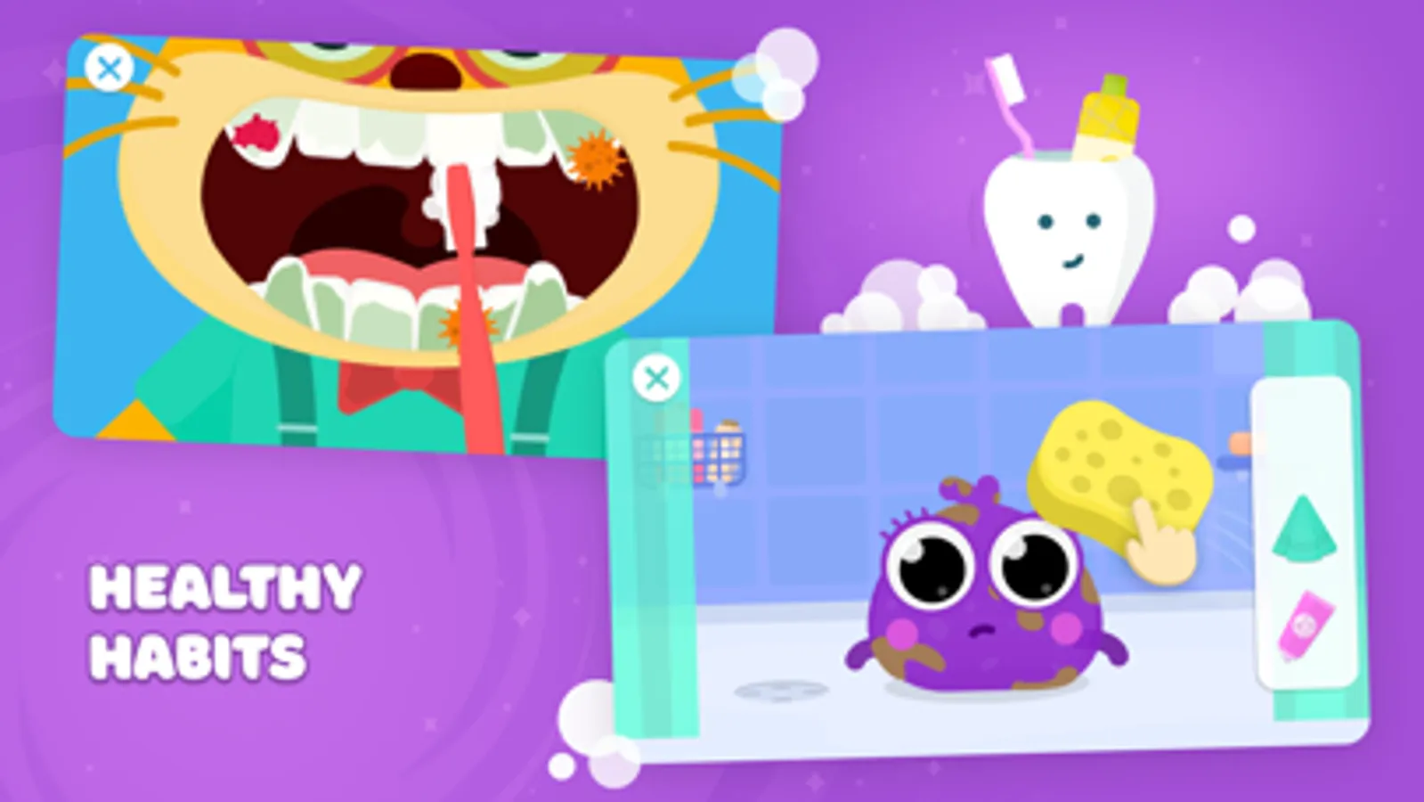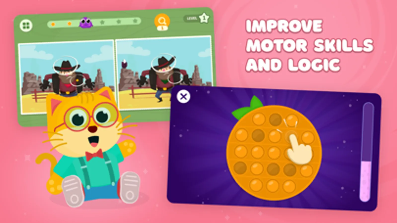 Your kid will learn to recognize shapes and sizes, colors, textures, as well as fruits and vegetables. The app will also help to develop good hygiene habits – Mike the cat will teach your child to brush their teeth, take a shower and go to bed on time. Moreover, the game will boost children's attention, motor skills, and common sense.