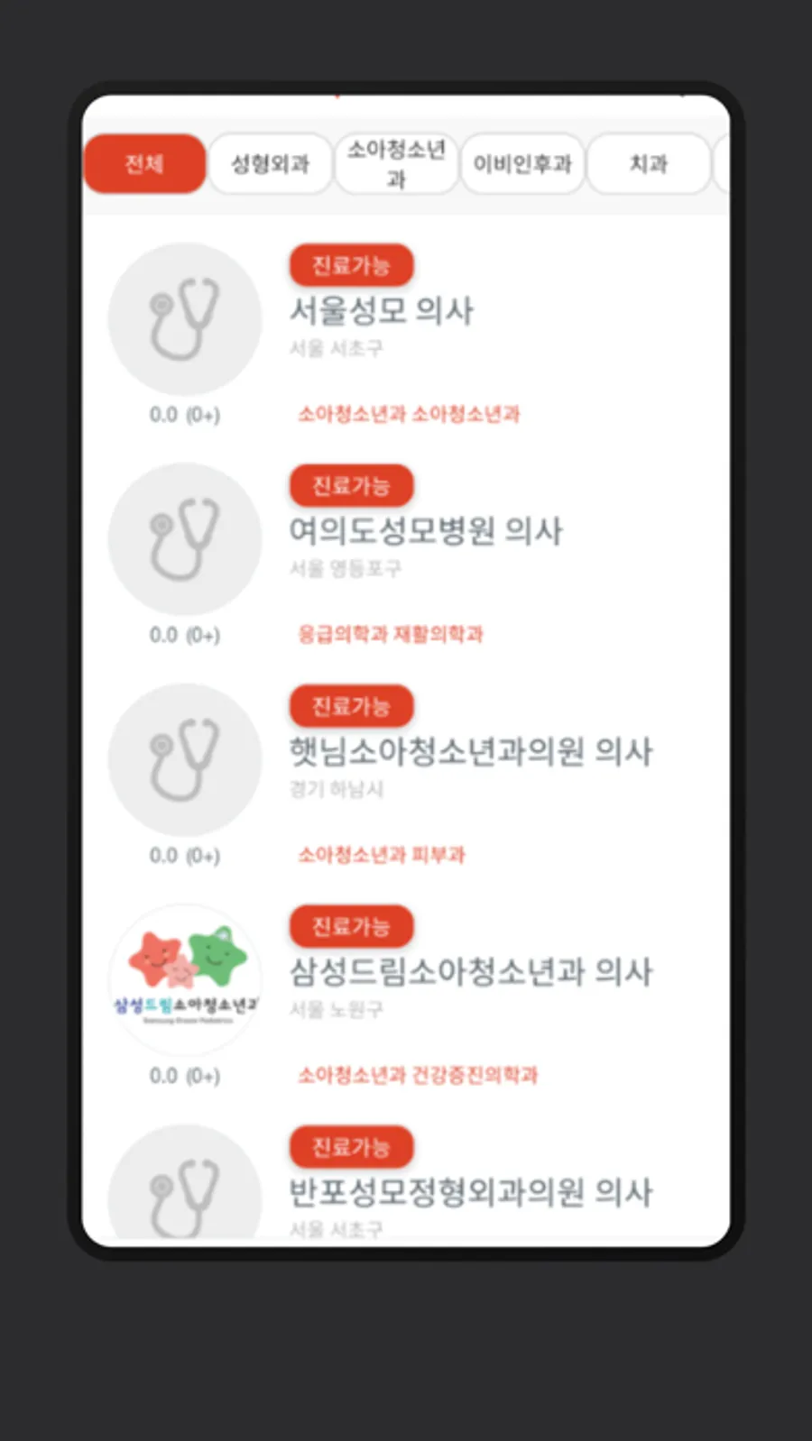 내과, 외과, 산부인과, 소아과, 이비인후과, 성형외과 등 진료과목 탭을 누르세요.