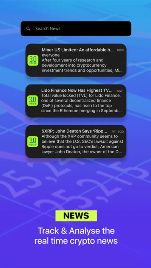 3.0 Verse focuses on making multi-market crypto trading accessible and streamlined for everyone. Our intuitively designed interface enables you to monitor lending and borrowing platforms, track DeFi coin performance, and access IC15 - the world's premier global cryptocurrency index. Receive timely alerts and utilize user-friendly tools to stay informed and ahead of the competition. Our app emphasizes simplicity, empowering you to make intelligent trading decisions and maximize your profits.
