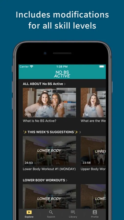 No BS Active is a fitness and lifestyle program for EVERY body designed by Whitney Thore and Jessica Powell. Whether you're a beginner or an experienced athlete, we make workouts work for you by providing multiple modifications with clear instructions for all levels. We celebrate all bodies by increasing strength, stamina, and confidence...and we have a lot of fun while we do it!