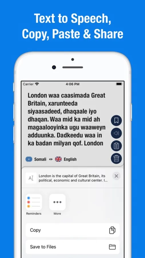 It is a translation tool that helps you break down language barriers. Excellent app for all who makes the first steps in learning Somali. Intuitive interface, easy navigation, quick result. Begin conversations confidently!