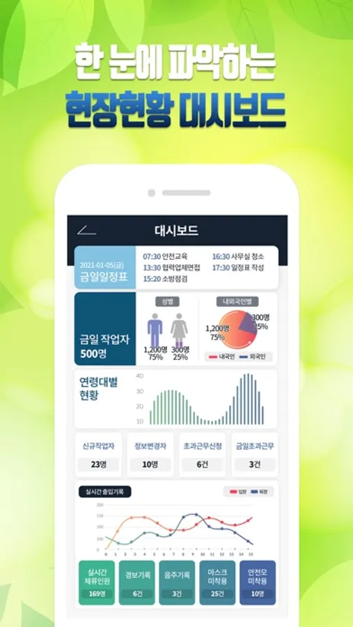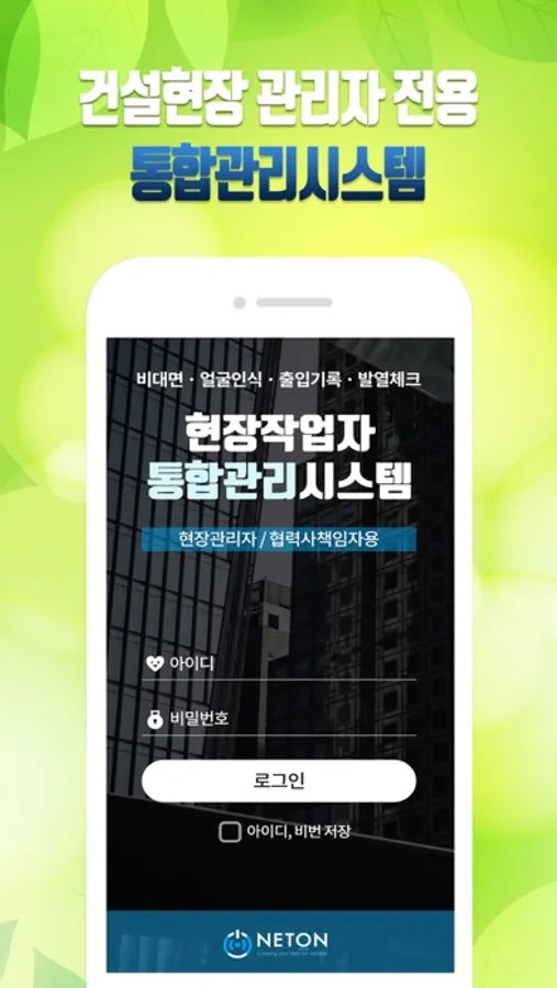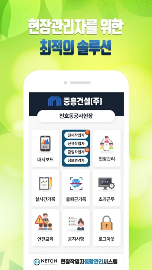 열센서리더기와 안면인식모듈을 탑재한 출입용 게이트를 통과 시에 각 작업자의 출입기록 및 발열기록, 음주기록, 출퇴근기록 등이 자동 기록되며 현장관리, 초과근무관리, 급여정산, 공지사항 등 현장관리자에게 필요한 다양한 기능을 가지고 있습니다.