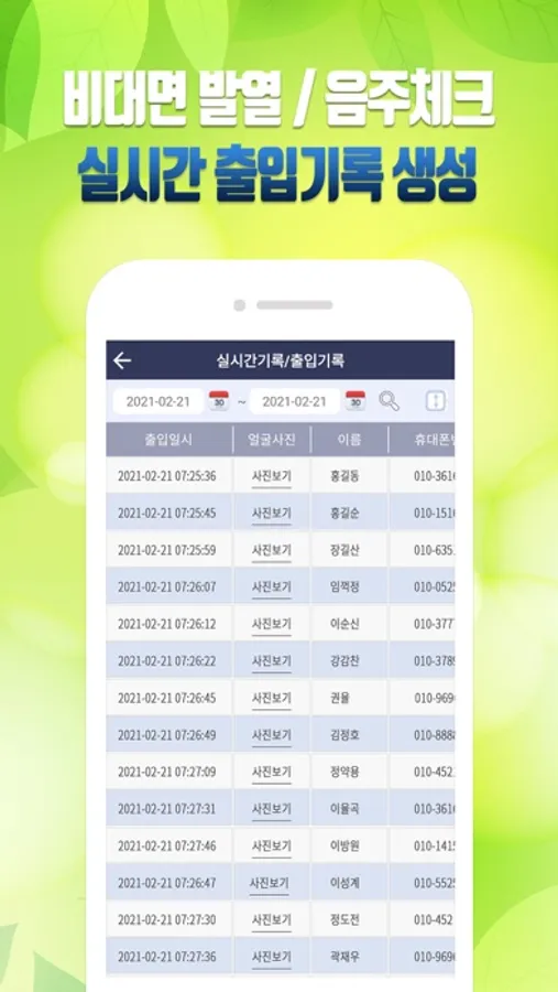 4. 실시간 기록 : 현장의 모든 gate의 출입기록이 실시간으로 표시됩니다. 또한 발열 작업자가 감지되면 경보기록에, 음주측정 시 알코올성분이 감지되면 음주기록에 각각 표시됩니다.