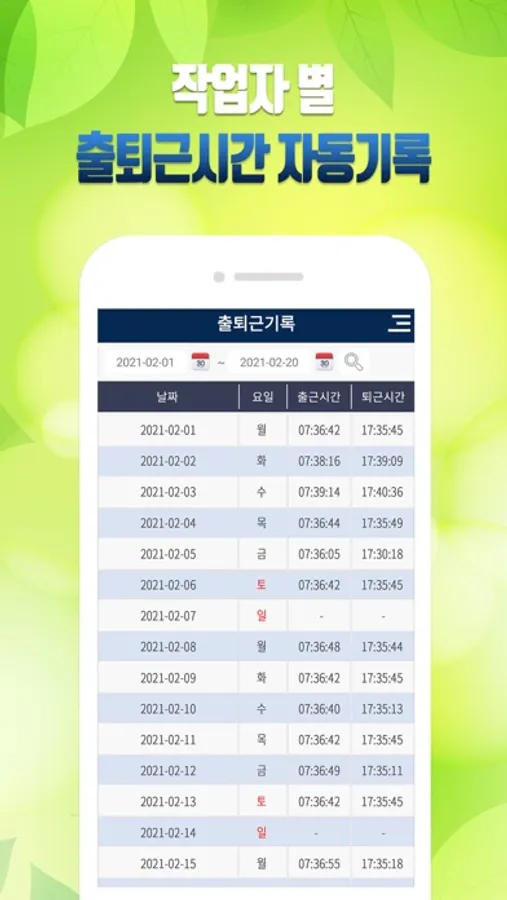 5. 출퇴근 기록 : 각 작업자별 출퇴근 기록이 표시되며 출퇴근기록과 초과근무기록을 토대로 급여정산을 할 수 있습니다.