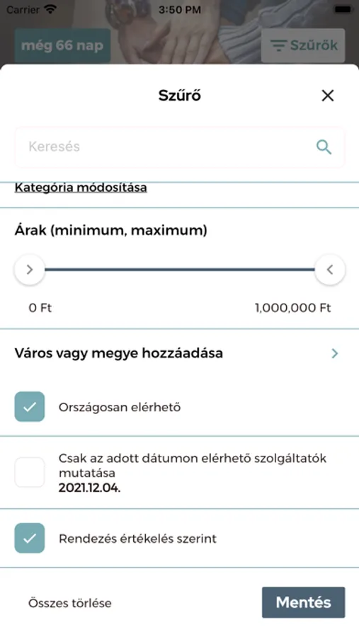 • ÁR – be lehet állítani, hogy milyen árkategória szerint keresünk Szolgáltatókat