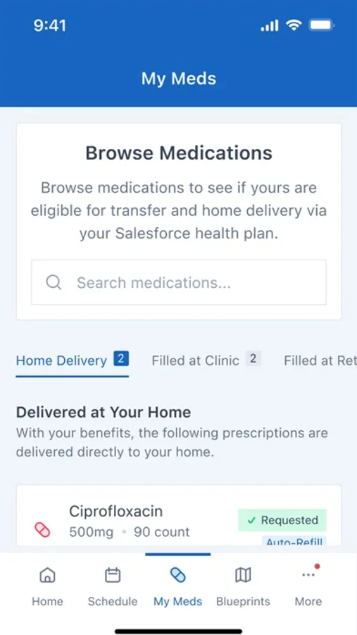 • Search for medications available for home delivery and at on-site health centers (as applicable) through the employer’s benefit plan