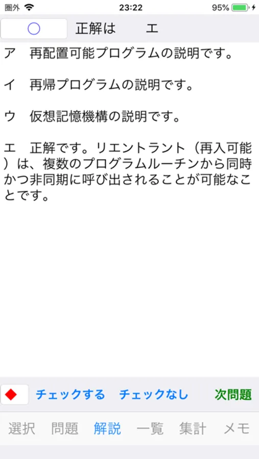 [解説]で、○(正解)、×(間違い)を確認します。全ての問題の解説を記載しています。チェックをつけておけば、あとから振り返るときに便利です。