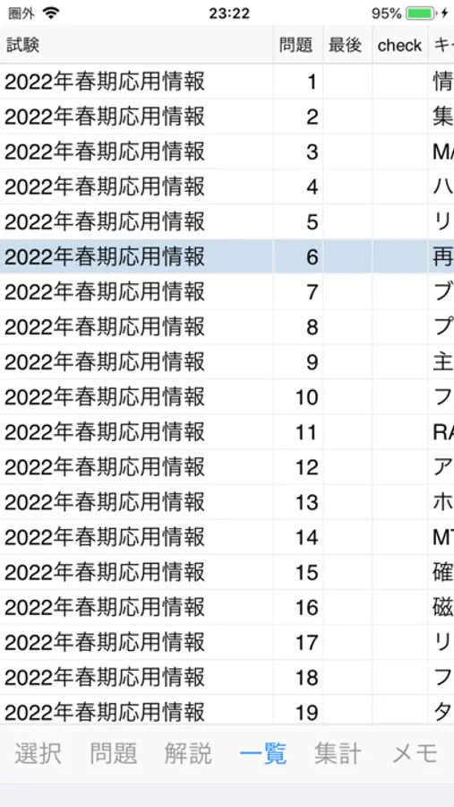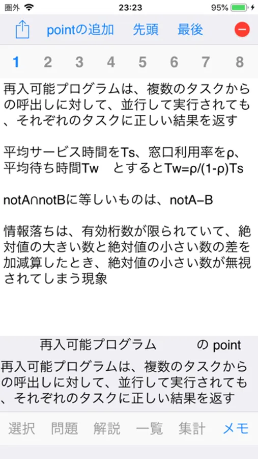 [メモ] は、メモを8つまで作成できます。問題によってはpointを登録していますので、メモに追加できます。共有ボタン(□に↑)をタッチすれば、メモをファイルに保存したり、メールで送ることができます。