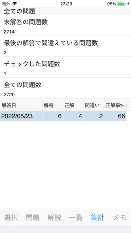[集計]は、解答日別に、解答数、正解数、間違い数、正答率を表示します。
