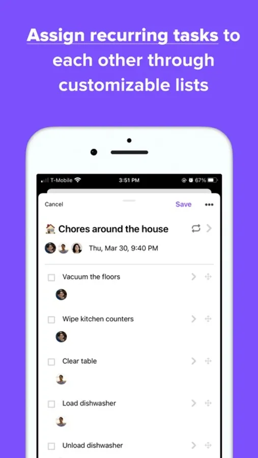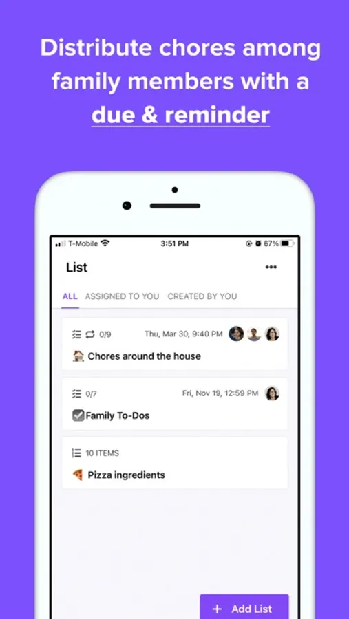 One family, shared responsibility. You can distribute housework among family members through shared to-do lists. For each chore list or even each to-do item, you can add a due and track progress. The flexible list feature also allows you to create personal to-dos that can be viewed by you only.