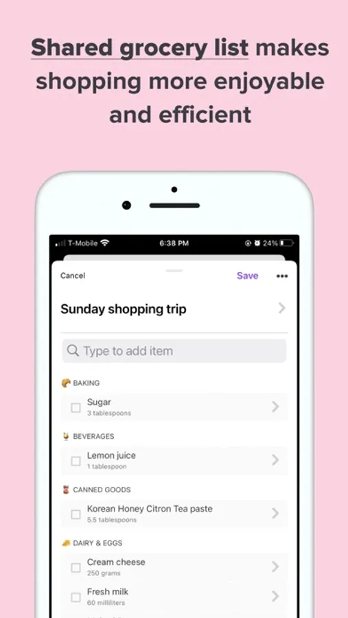 Everyone can add items to the shared shopping list and the list gets synced in real time for all family members. Whoever does the shopping can save time on shopping and get all items in one trip. You can also organize your list by categories and customize the catalog.