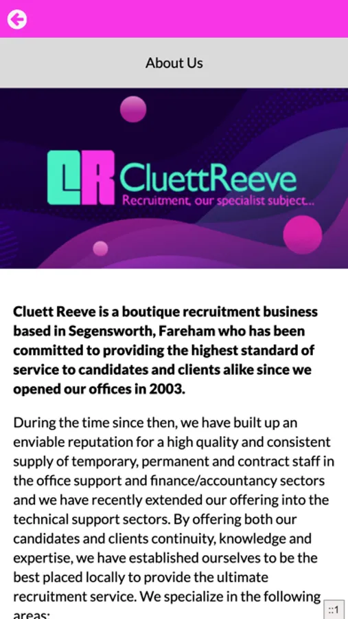 Cluett Reeve is a boutique recruitment business based in Segensworth, Fareham who supplies temporary and permanent staff to clients across Hampshire. We have been committed to providing the highest standard of service to candidates and clients alike since we opened our offices in 2003. Since then we have built up an enviable reputation for a high quality and consistent supply of temporary, permanent and contract staff in the office support, finance, technical and industrial sectors. By offering both our candidates and clients continuity, knowledge and expertise, we have established ourselves to be the best placed locally to provide the ultimate recruitment service.