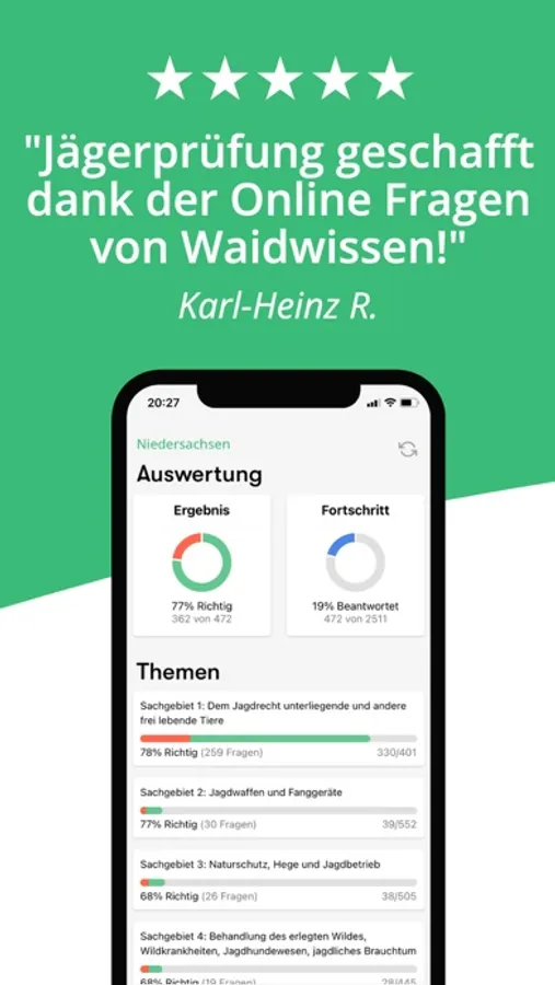 Nach vielen tausend Stunden an Arbeit und über 10.000 Feedbacks haben wir jetzt die Lösung für dich. Wir haben mit Waidwissen eine vollkommen einzigartige App entwickelt, die Lernen und Verstehen vereint und einfach auf den Punkt kommt. Keine Papierflut. Kein Informationschaos. Nur das Nötigste, damit du entspannt durch deine Prüfung spazieren kannst.