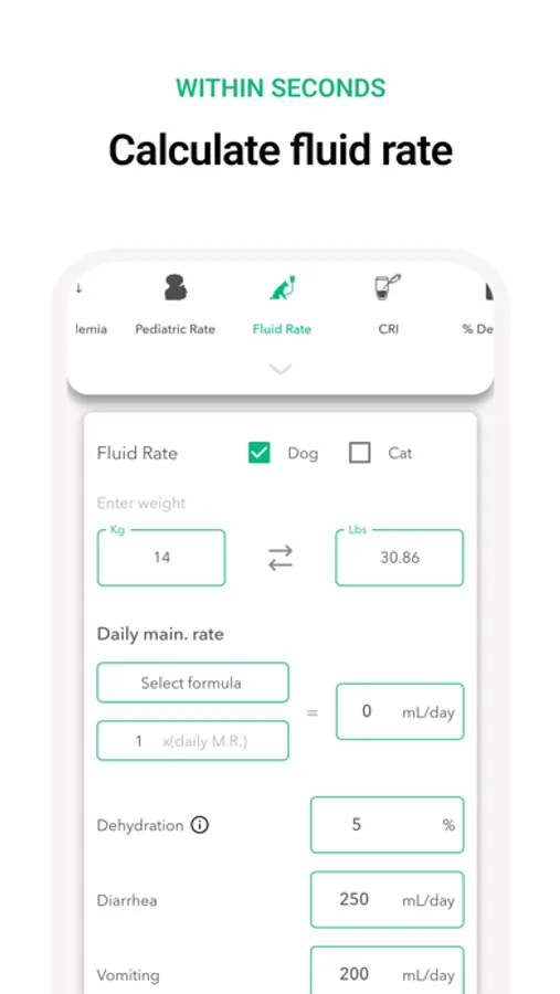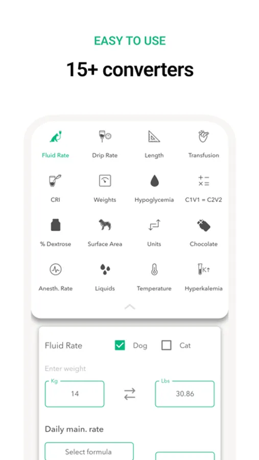 Our intuitive and user-friendly interface saves valuable time and eliminates errors in drug dosing calculations, ensuring that your patients receive the best possible care. Plus, Vet Easy offers 15+ converters, including fluid rate calculator, % Dextrose solution, CRI calculator (single and multi-drug), RER and MER, Blood transfusion, Pediatric rate, Shock rate, Anesthesia rate, Drip rate, Hypokalemia Rx, Hypoglycemia Rx, Weight conversions, Length conversions, Liquid conversions, Temperature conversions, and Body surface area calculator.