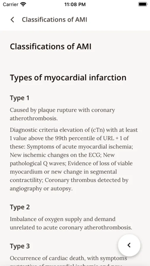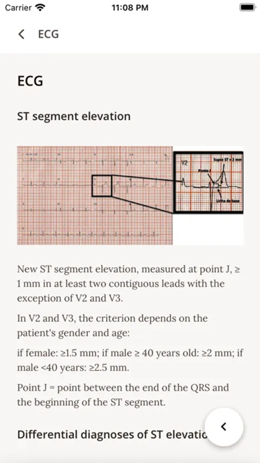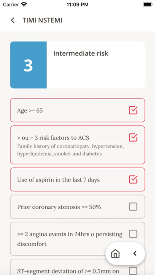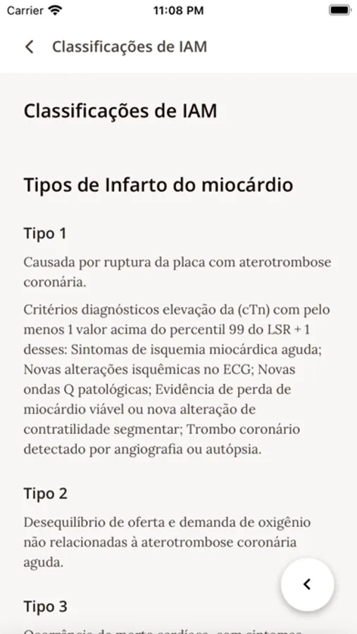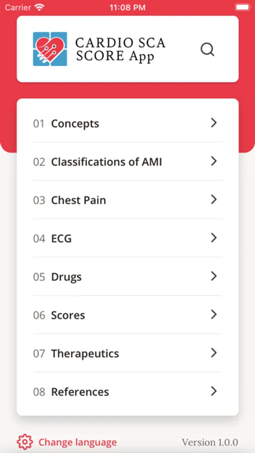 O App possui oito subtópicos, a saber: conceitos, classificação de IAM, dor torácica, ECG, fármacos, escores, terapêuticas e referências. Destaca-se os escores de estratificação dentre eles: TIMI Risk (p/IAMSSST e P/ IAMCSSST), GRACE, Pursuit, Frisc, o escore para setores de emergência HEART, o escore para sangramento CRUSADE e os escores brasileiros DANTE e HCor (para 30 dias e para 6 meses). Aliado a conceitos básicos , indicações de trombólise, dose de drogas, imagens de ecg que auxiliem conduta, diagnósticos diferenciais e referências.