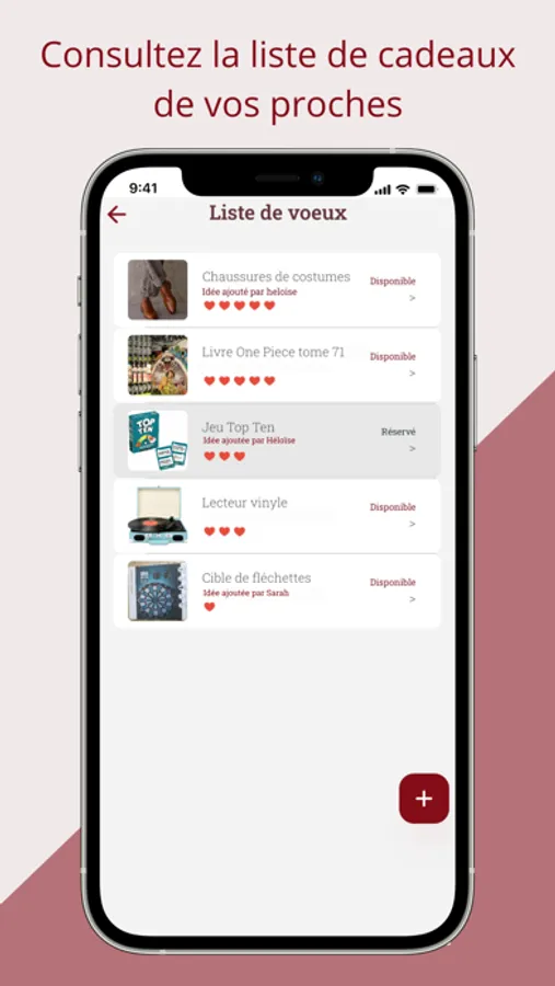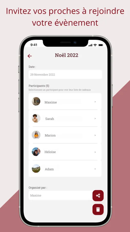Regroupez au sein d’un même évènement votre liste de cadeaux et les listes de vos proches. Réservez des cadeaux sur leurs listes ou ajoutez-en. Le tout, à l’insu de la personne concernée afin de garder l’effet de surprise et éviter les cadeaux en double le jour J. Vous pouvez également créer des listes de cadeaux pour les personnes sans smartphone comme les enfants ou les grands-parents.