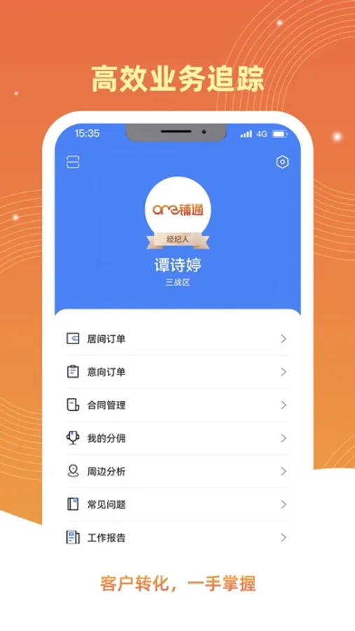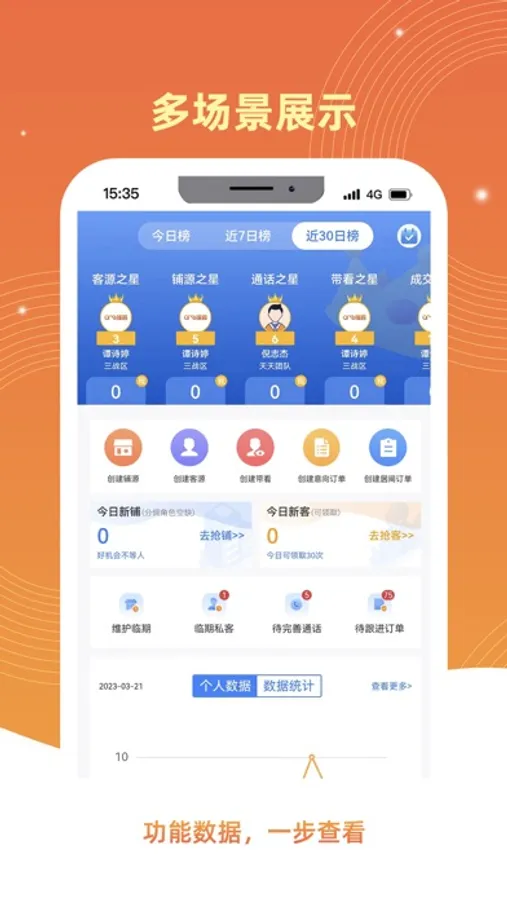 关于您的铺源、客源、订单、佣金、审核等数据实时统计展示,个人业绩一目了然,目标冲刺更清晰。