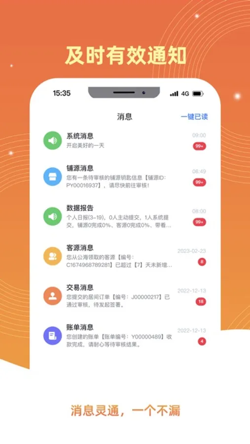 与您相关的铺源、客源、订单动态信息及其他相关业务信息及时提醒,让您不错过重要信息;