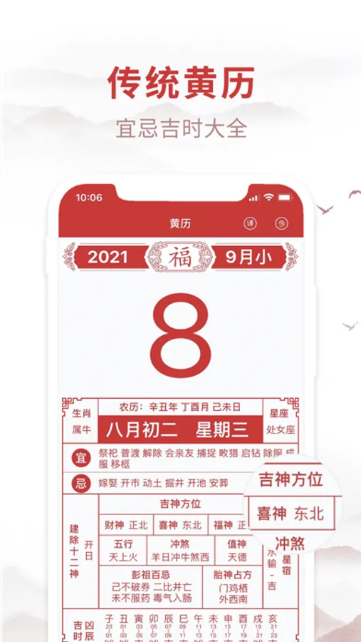 传统黄历:精准全面的黄历内容,让你可以关注每天该做和不该做的事情,出门看黄历,事办功倍,办事挑好时,事事顺心;