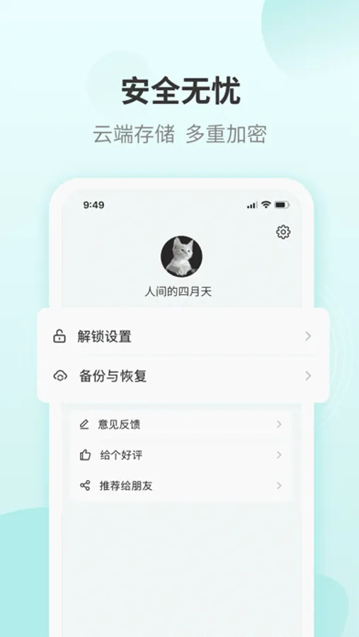 安全可靠:多种解锁设置,数据安全尽在掌握,双重云端加密存储,数据安全双保险。