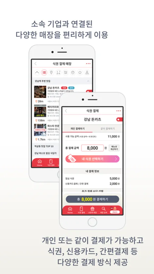 - 기업 고객 식대 발급, 가맹점 검색/조회, 결제수단 확인 및 간편 결제