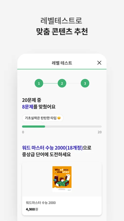 '레벨테스트' 기능을 사용하면 내 실력을 정확히 측정한 후 실력향상에 도움이 되는 콘텐츠를 추천해 드려요.