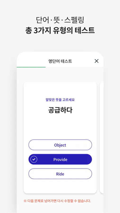 '한글 뜻 맞추기'는 물론이고 '영단어 맞추기', '스펠링 테스트'까지 다양한 테스트 옵션으로 외운 단어를 더 확실히 점검하세요.