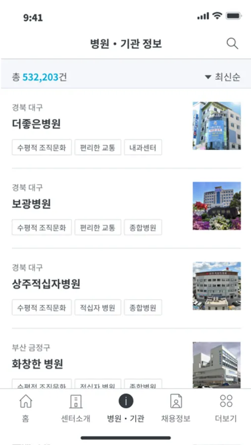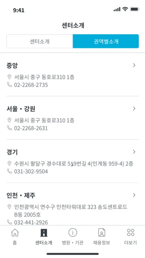 - RNJOB에 등록된 병원·기업정보를 통해, 내가 소속된 권역에 위치한 병원·기업정보를 확인할 수 있습니다.
