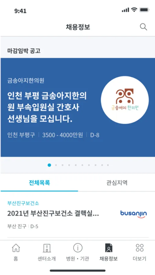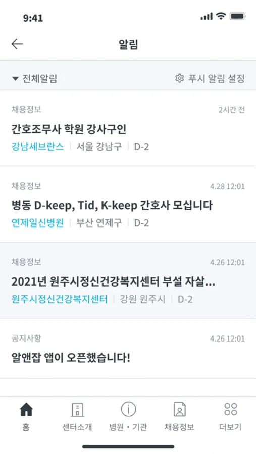 - 설정된 지역에 위치한 병원·기업에서 채용공고를 게시하면, 그 정보를 푸시 알림을 통해 전달받을 수 있습니다.