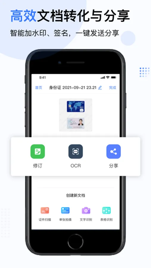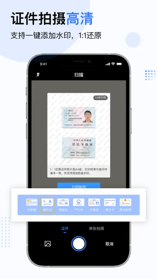 ● 支持身份证、护照、企业三证、户口本等近百种证件扫描,1:1 生成高清扫描件,可用于证照资料提交、电子开户等;