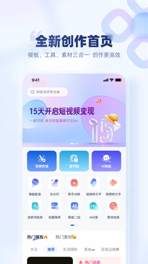 不同于其他单一模式产品,创作猫以短视频创作者的真实需求出发,通过内容+工具的模式让短视频创作更简单,提升变现效率!