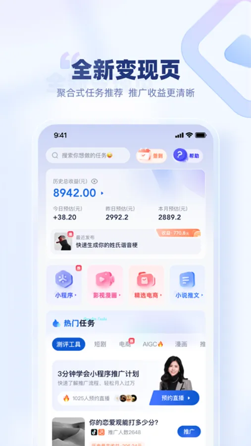 -小程序任务台:支持推广0粉任务及多种推广方式,操作简单易上手,只需发布视频推广小程序任务,新手也能轻松变现。