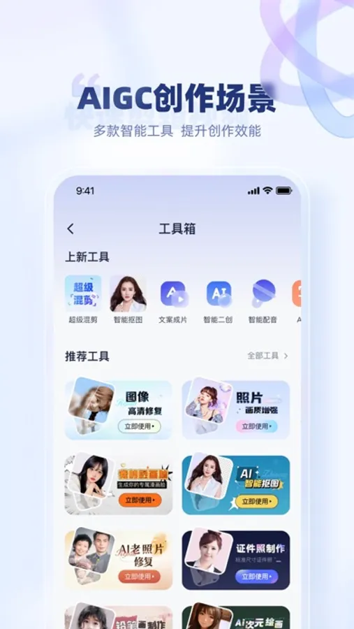 -强大的创作工具包含:去水印、智能二创、AI问答、文案成片、超级混剪、照片高清修复、漫画脸、老照片修复 、铅笔画制作、照片动起来、智能抠图、超清人脸修复、照片画质增强、最美证件照、九宫格、智能配音、违禁词检测、链接转文字、视频转文字、数据监控、账号检测等,一个平台满足所有创作需求,充分提升短视频创作效率。