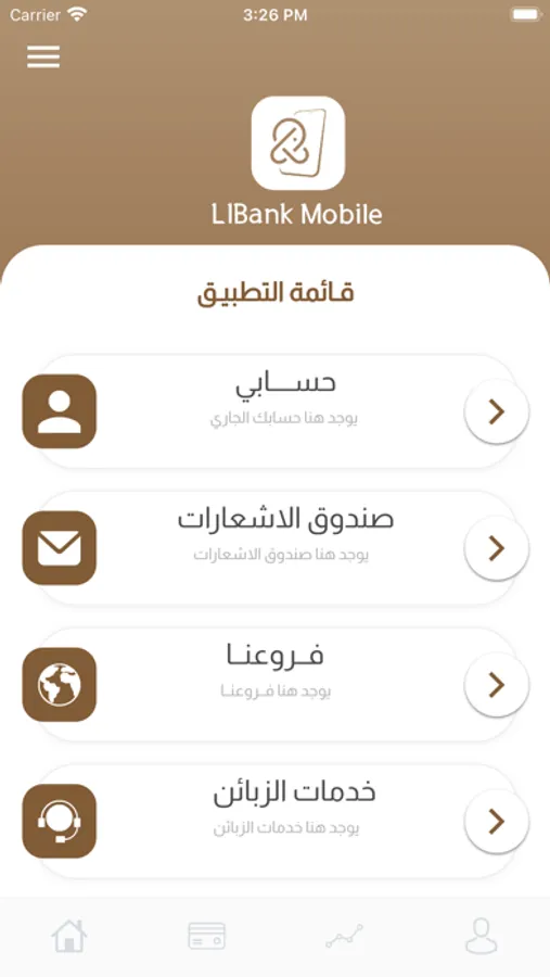يتيح تطبيق ليبانك Libank لزبائن المصرف الإسلامي الليبي التمتع ببعض الخصائص مثل الاطلاع الحسابات و ارصدتها و التحويل بين الحسابات و شراء كروت الشحن المختلفة.