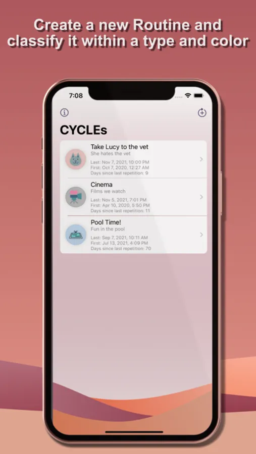 In your day to day, routines appear that are repeated over time. With Cycle you can take control of these routines and see how they evolve. Classify each routine with an icon and a color.