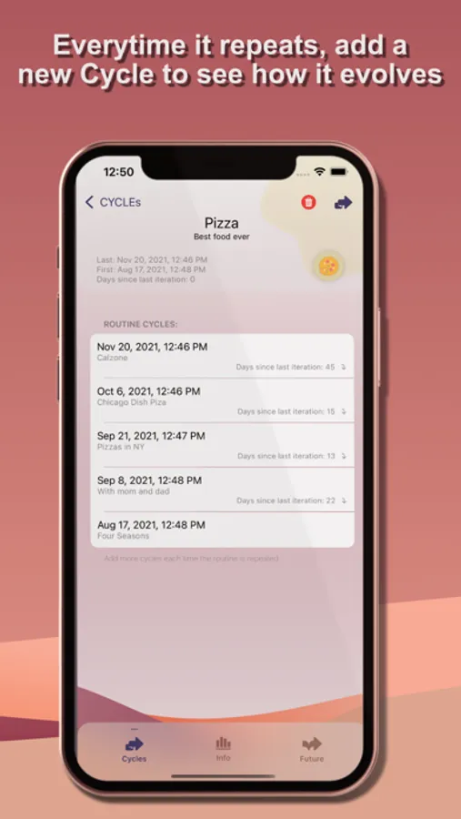 Every time the original routine is repeated, add a new cycle. Save a description of each cycle to document the progress of the routine and to be able to refer to past iterations.