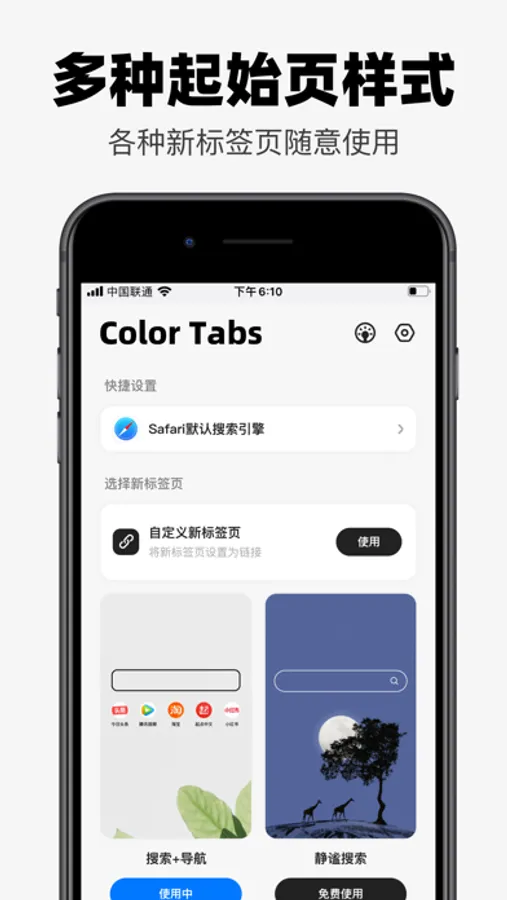 除了超高的颜值,Color Tabs也拥有不俗的实力,支持自定义设置网址为起始页,启动Safari一键直达目标页面,多种搜索引擎随意使用,不同类型网址导航一目了然。