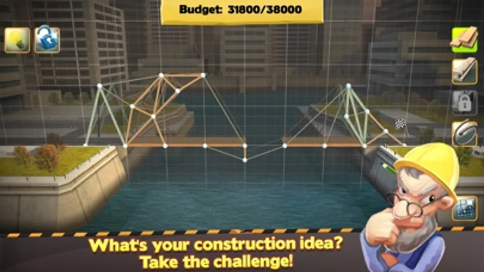 You can choose from a range of materials for each individual bridge, such as wood, steel, cables, or concrete pillars. Use the appropriate materials and stay within budget to build the perfect bridge. The choice of different materials means that there are numerous solutions and approaches and you can build each bridge in any number of ways – your budget is the only limit. And if you happen to run into a dead end, you can pick up valuable tips from the help system!
