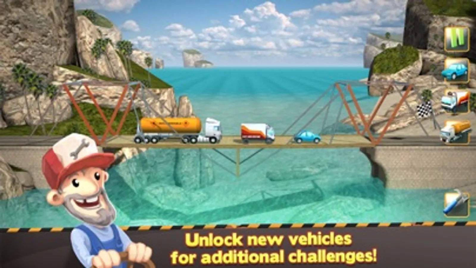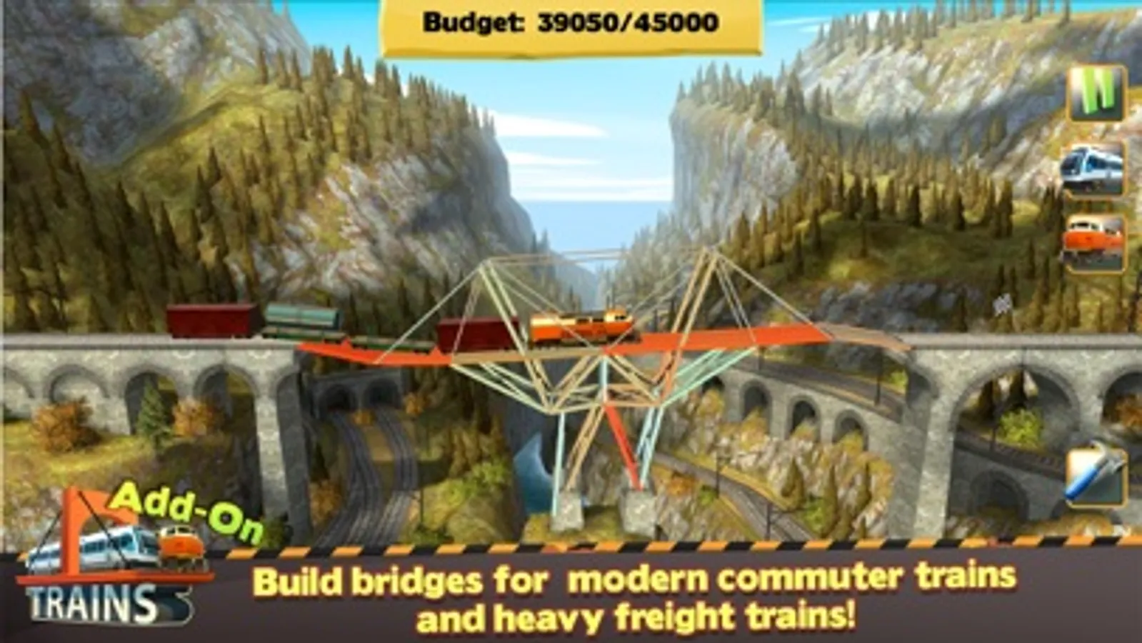 Visit the Choonited Kingdom island group in the Trains add-on, with a total of 18 new levels across three islands. Build massive bridges that can withstand the enormous weight of the two new vehicles on offer – a commuter train and a heavily loaded freight train. The idyllic and beautifully designed landscapes will make the heart of every railroad fanatic skip a beat.