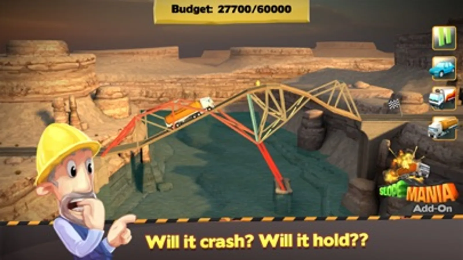 In Bridge Constructor+ you have to prove yourself as an accomplished master bridge builder. Play 40 different levels, and build bridges over deep valleys, canals, and rivers. Stress tests reveal whether the bridge you build can withstand the daily stress of continual use from cars, trucks and, more recently, super-heavy tank trucks.