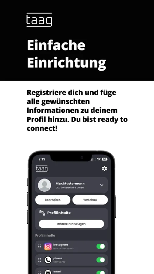 Richte dein Profil ganz einfach ein: Zum Einrichten deines Profils, scannst du einfach den QR-Code auf der Karte, die mit dem Taag kommt. Dann registrierst du dich, fügst alle gewünschten Informationen zu deinem Profil hinzu und du bist ready to connect!