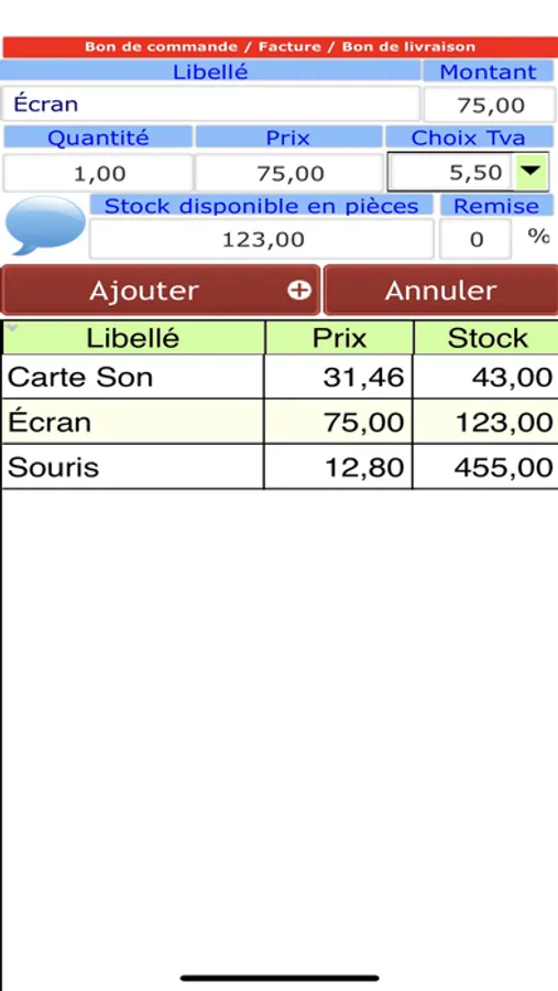 Gestion de stock, bon de commande, bon de livraison, facturation, relances client.