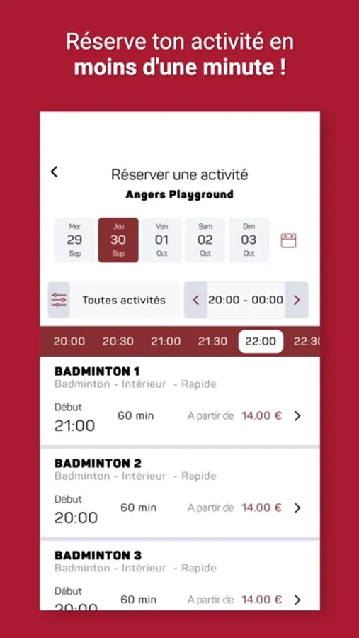 Fini la corvée de réservation ! Avec l'application tu n'as plus qu'à accéder aux créneaux disponibles et à en choisir un. Le club recevra alors automatiquement ta réservation.