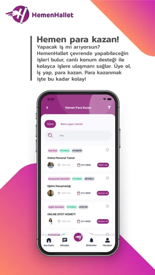 Yeteneklerin olsa da olmasa da HemenHallet ile para kazanabilirsin. Sadece HemenHallet ile yapacağın işlerle bile kendi işinin patronu olabilirsin. Eğer bir işletmen varsa HemenHallet işlerini tanıtmak ve kazancını artırmak için en hızlı çözüm! HemenHallet’i indirdikten sonra 3 kolay adımla iş alabilirsin: