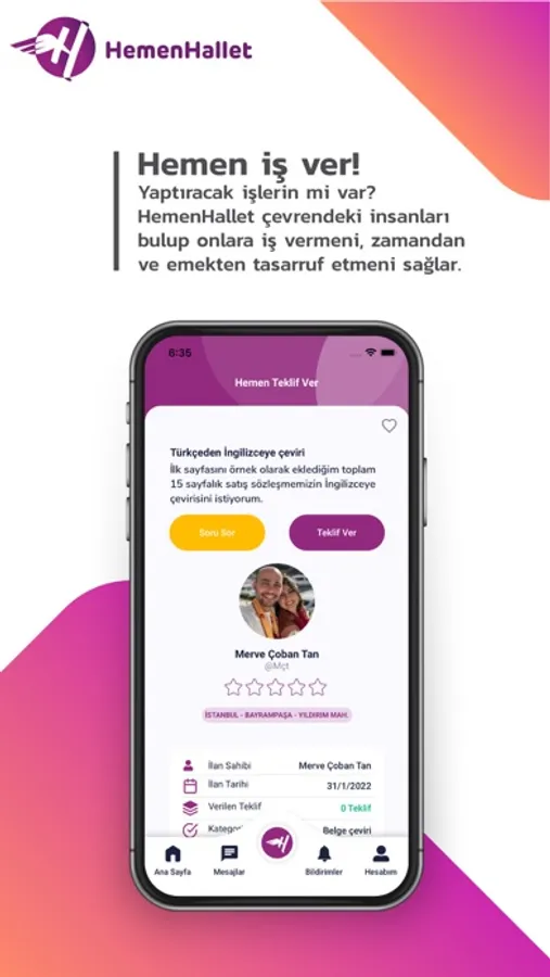 Yaptıracak bir işin var ve bu işi en iyi ve en uygun fiyata yapacak kişiyi arıyorsan doğru yerdesin. HemenHallet’i indirdikten sonra 3 kolay adımla iş verebilirsin: