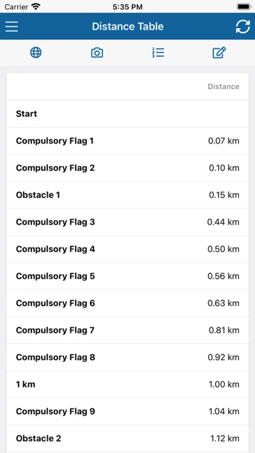 • Obstacle, compulsory flag and kilometer marker list with distances and times.