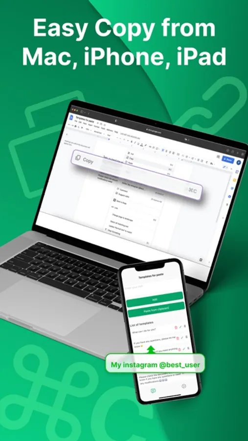 The main feature (uniqueness) of our app is the ability to quickly and easily create text templates for immediate paste on any of your devices: Mac, iPhone, iPad, or iPod.