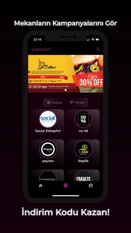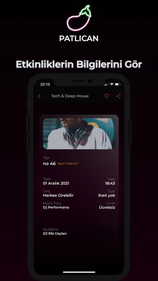 Patlıcan, şehrindeki mekanların düzenlediği etkinlikleri, menüleri ve kampanyalarını görmeni sağlar.