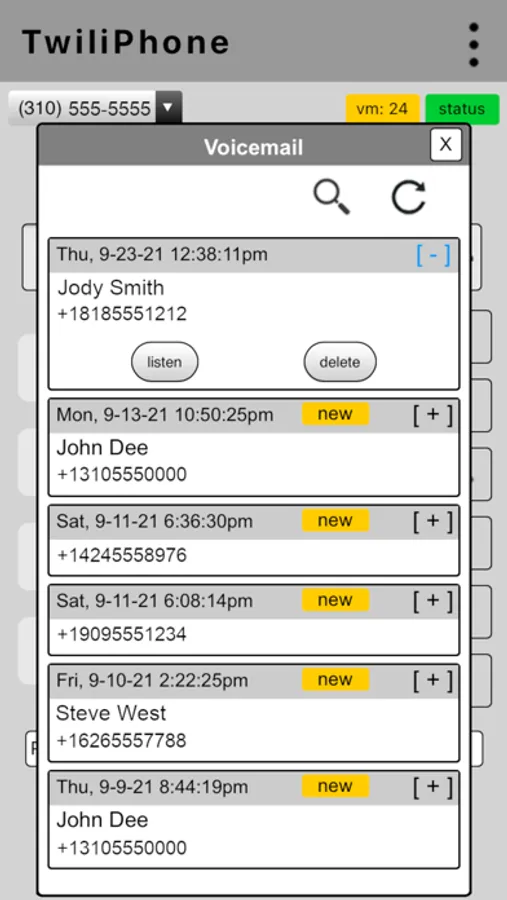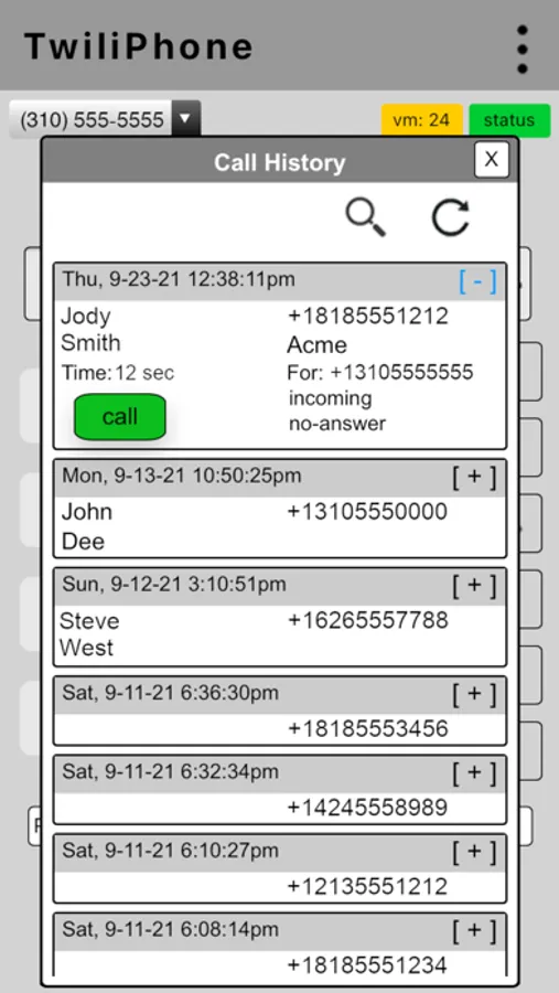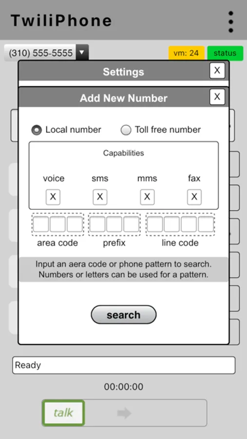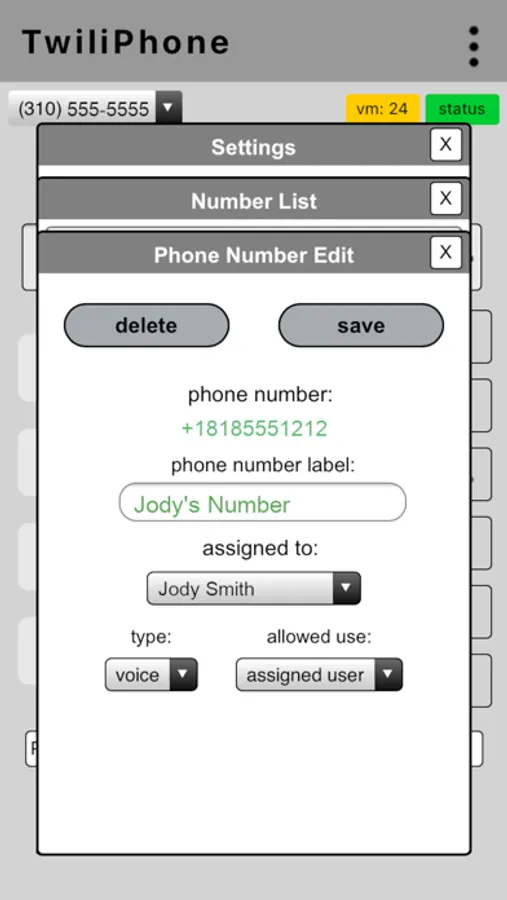 TwiliPhone is a companion app to be used with your Twilio account to make and receive phone calls. TwiliPhone stands alone by providing advanced phone features that can be used with multiple phone numbers. Some of the advance features are: putting multiple callers on hold, conference calls with up to 100 callers, transfer calls to users on your account or to any domestic phone number or to your voicemail, even transfer callers from your hold list or your conference call list; custom speed dialer, view call history, listen to your voicemail, receive email notifications of voicemails, forward calls to a different number. Within our app assign phone numbers to different users or setup one number for all users to make outbound calls. Can easily be setup to make inbound and outbound calls with almost any voip (ip) phone in your home or office. Can Ring up to 10 voip phones simultaneously assigned to the same user. Add numbers from your Twilio account; search Twilio's available phone numbers via area code or number or word pattern including toll free numbers and instantly add to your account.