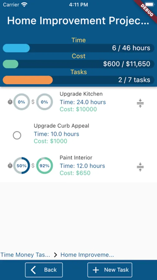 Manage any sort of project the right way with Time Money TaskList (TMT). All projects consist of tasks. All tasks take a certain amount of time and money. Keep track of completion and totals with TMT. Add tasks with subtasks into the app with cost and time estimates. TMT will keep track of aggregates of the total costs and completed costs so you can track progress and see what tasks are left to complete a project. Can be used for small projects like a home improvement project, can be used for large projects, like purchasing a new building for a business.